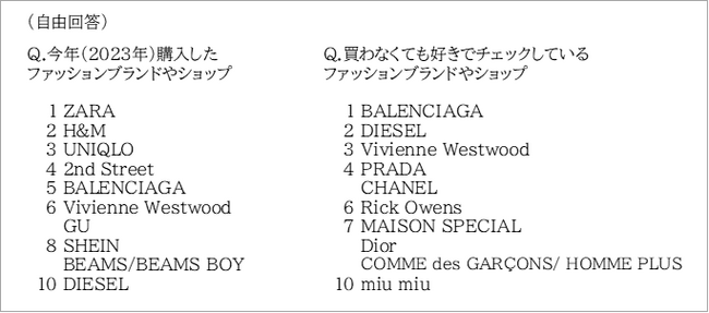 おしゃれZ世代が「今年購入したファッションブランドやショップ」「買わなくても好きでチェックしているファッションブランドやショップ」を自由回答で聞きました。