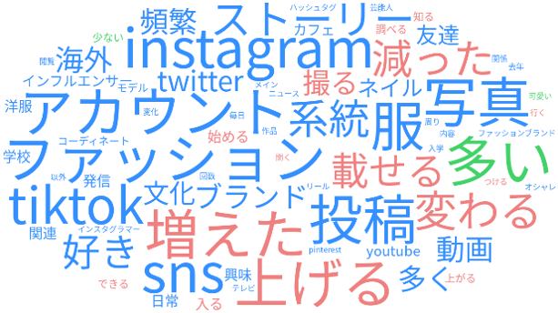 「昨年から今年の間にメディアやSNSの使い方がどう変わったか」を自由回答で聞きました。外出が増えて周囲からの刺激を受けるようになったためか、“高校生っぽさ”を卒業し、SNSで見る情報も投稿内容もファッション寄りに変化しています。