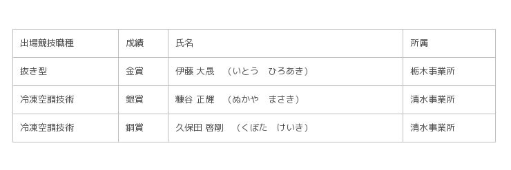 今年の技能五輪には、当社から3職種に4名が参加しました(栃木事業所:「抜き型」1名、清水事業所:「冷凍空調技術」2名、「フライス盤」1名)。技能五輪全国大会は、厚生労働省、中央職業能力開発協会および開催都道府県により年1回開催されている技能レベルの日本一を競う技能競技大会であり、次代を担う青年技能者を対象に技能向上の目標と、大会開催地域の若年者に優れた技能を身近にふれる機会を提供することなどを通じて技能の重要性、必要性を広くアピールすることを目的としています。今年は47都道府県から1,292名の選手が参加し、42の職種で日々磨き上げてきた技を競い合いました。