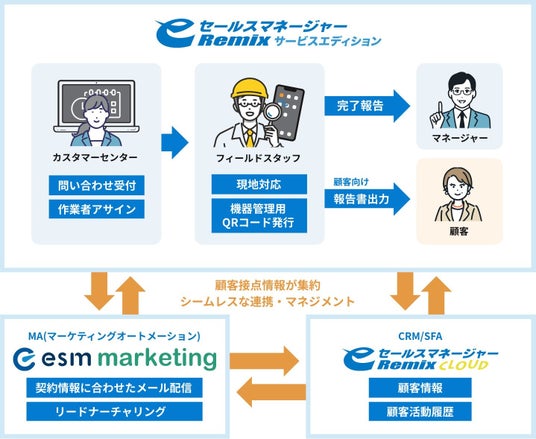 高機能なCRM/SFA「eセールスマネージャーRemix Cloud」を中核に、MA(マーケティングオートメーション)ツールの「esm marketing」、アフターサービス向けマネジメントツール「eセールスマネージャーRemix サービスエディション」の導入実績から得られた顧客接点プロセスマネジメントの実践的なノウハウを持っています。それらを組み合わせた課題解決ソリューションをご提供し、お客様の生産性の最大化に貢献できる取り組みを続けています。