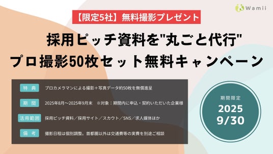 ワミィ株式会社(本社:東京都渋谷区、代表取締役:伊藤和歌子)は、2025 年8月~ 9月末の期間限定で、採用ピッチ資料作成代行サービスをご契約いただいた先着5社に、プロカメラマンが撮影した写真データ(約50枚)を無償提供するキャンペーンを実施いたします。