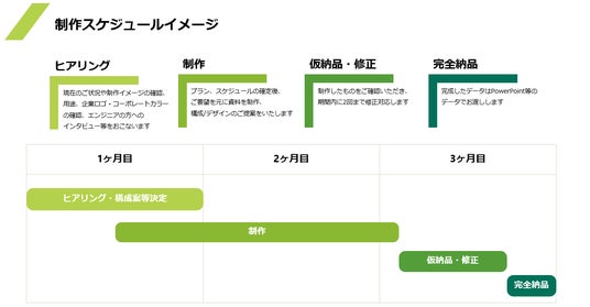 初回ヒアリングから納品まで通常約3ヶ月。スピード制作オプションなら最短1.5ヶ月での納品も可能です。