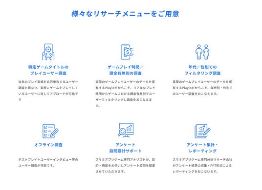 Playio Researchの母体となるPlayioは韓国・米国内では300万ダウンロードを突破した韓国発ゲーム配当サービス。日本版は5月14日に正式サービスを開始。本データベースであるユーザーのリアルなプレイデータを活用できる国内唯一のリサーチメニューであり、プレイ時間や課金有無別など、さまざまな切り口でのアンケート調査が可能になります。