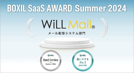 「BOXIL SaaS AWARD(ボクシル サース アワード)」は、SaaS(※)比較サイト「BOXIL SaaS(ボクシル サース)」を運営するスマートキャンプが、優れたSaaSを審査、選考、表彰するイベントです。今回の「BOXIL SaaS AWARD Summer 2024」は、2023年4月1日~2024年3月31日までの1年間に「BOXIL SaaS」上へ新たに投稿された口コミ約18,000件をもとに審査しています。今回「WiLL Mail」が受賞したメール配信システム部門の「Good Service」は、「BOXIL SaaS」上に投稿された口コミを対象に、各カテゴリで総得点の高いサービスに対して付与されるものです。