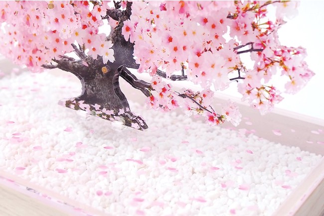アクリル台には色づいた花びらが風に乗って地面に散った様子で描かれ、自然なかたちで美しく散るよう花びらが受ける風向きも計算されています。