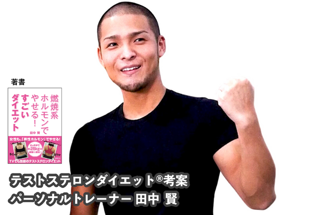 田中トレーナーは、2ヶ月半で―25kgの減量を成功させた実績があり、テストステロンダイエット(R)というダイエット法を提唱しています。そのダイエット法のノウハウや体験談を紹介した実用書、講談社「燃焼系ホルモンでやせる!すごいダイエット」を出版しています。現在、田中トレーナーが代表を務めるBIANCA(ビアンカ)ジムでは、全国対応のオンラインダイエットサービスを提供しており、テストステロンダイエット(R)を全国の方が体感できるようになっています。