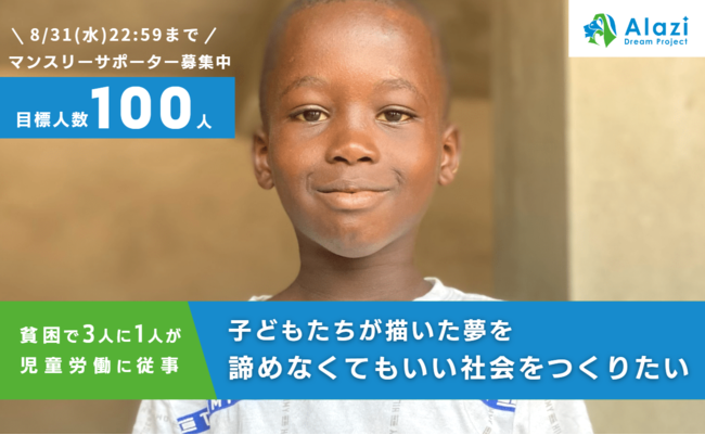 1日15円~の寄付で、現状を変える、100名のマンスリーサポーターを募集。8月31日まで。