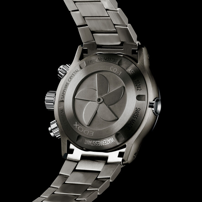 腕に沿うように設計されたラグ、エッジの効いたシャープなフォルム、ヘアライン&鏡面加工の異なるケース仕上げなど、ラグジュアリースポーツウォッチと呼ぶにふさわしい装飾が施されています。ケースバックには、パワーボートで最も重要なパーツのひとつ、プロペラを刻印。腕との密着を防ぐことで装着感の向上に役立っています。