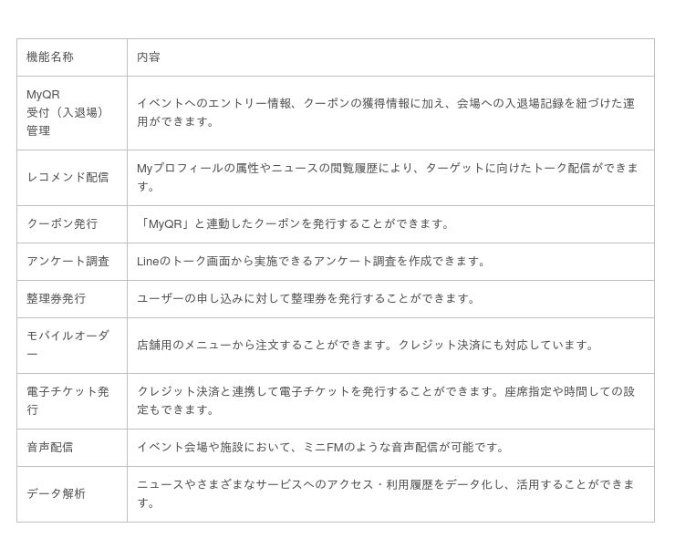 主な機能:イベントエントリー機能、レコメンド配信、チャットbot、クーポン発行、