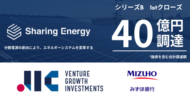 太陽光発電システムの第三者所有サービス「シェアでんき」を提供する株式会社シェアリングエネルギー(本社:東京都港区 代表取締役:上村一行)は、シリーズB資金調達のファーストクローズにおいて、JICベンチャー・グロース・インベストメンツ株式会社を引受人とする第三者割当増資により資金調達を実施しました。同時に、みずほ銀行との融資契約を締結(※2)し、第三者割当増資と融資を合わせて総額40億円の資金調達を実施したことをお知らせします。これにより、当社グループの累計資金調達額は約66億円になります。