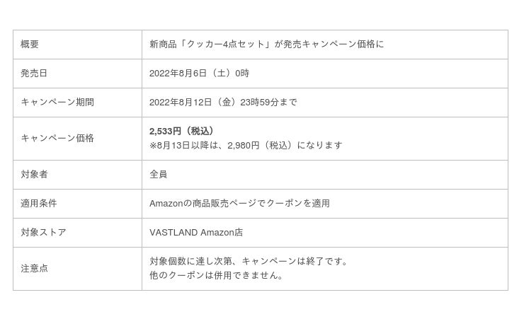 VASTLAND株式会社(本社:兵庫県姫路市/代表:田中悠貴)は、マルチな使い方ができ、チタンやステンレス素材に比べ、熱伝導率が高いアルミニウム素材を採用した「クッカー4点セット」を2022年8月6日(土)にAmazon店で先行発売することを決定しました。また発売を記念して、Amazon店限定で「発売キャンペーン」を開催します。