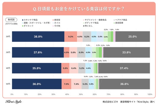 「今のキレイも、10年後の輝きも」をコンセプトに美容や健康にまつわる情報を発信する「Kirei Style(キレイスタイル)」の運用を行う株式会社ビズキは、全国の女性2,000人を対象に美容に関するアンケートを実施し、年代別等の特徴についてまとめました。