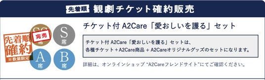 先着順にて確約販売しておりました、SS席・S席チケット付きA2Care『愛おしいを護る』セットが、大好評につき即完売となりましたので、第2弾の販売を開始いたしました。