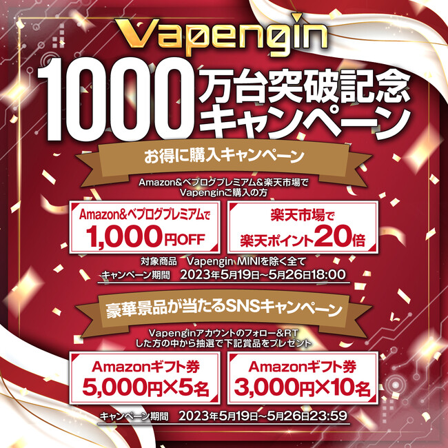そして、この度Vapenginは全世界累計販売1,000万台を突破致しました。それを記念して「Vapengin1000万台突破記念キャンペーン」を5月19日から5月26日の期間で実施致します。