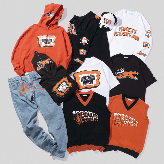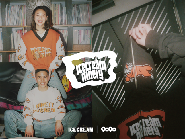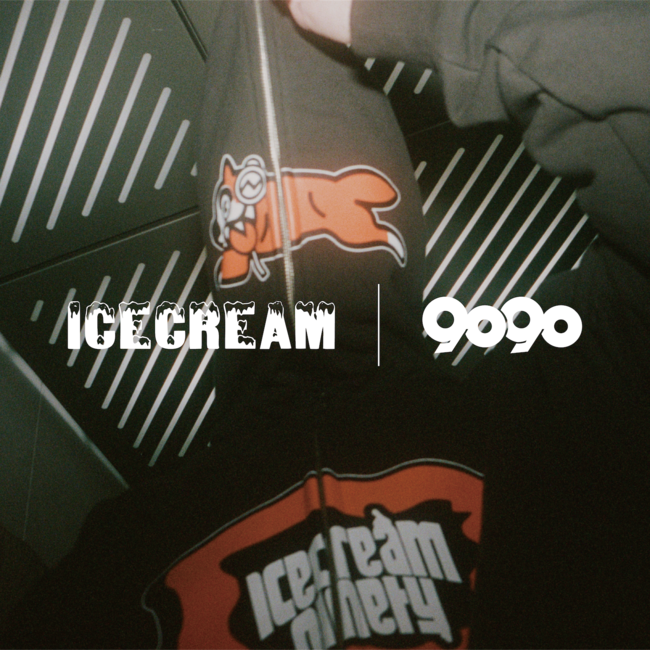 yutori が展開するストリートブランド「9090(ナインティナインティ)」は、2003年にファレル・ウィリアムスによって設立された ICECREAM(アイスクリーム)とのコラボレーションを発表いたします。ICECREAM のシンボルでもある「ランニングドッグ」や「コーン&ボーン」に、9090 のシンボルであるヘッドフォンやロリポップを掛け合わせたコラボデザインで、ジップフーディー / ニットベスト / デニムパンツ など計6型を展開。