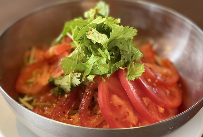 暑い夏にピッタリの「麻辣」ソースに、夏に美味しいトマトをたっぷり。トマトの爽やかな酸味と旨味。香菜(シャンツァイ・パクチー)が味をまとめて、引き立てます!各日、数量限定でご提供中!