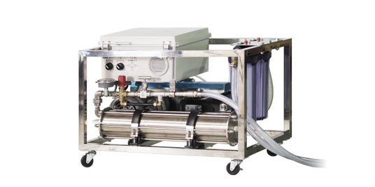 高圧に耐えられる逆浸透膜(RO)格納容器が実現する、小型で可搬性に優れた淡水化装置です。E-60 は 家庭用の100V電源で動作し、1 時間に海水から真水を約60 リットル(淡水の場合は 約120 リットル)作る事が出来る小型の海水淡水化装置です。 E-250 は、三相 200V 電源で動作し、E-60 の約 4 倍程度の浄水能力を持ちます。