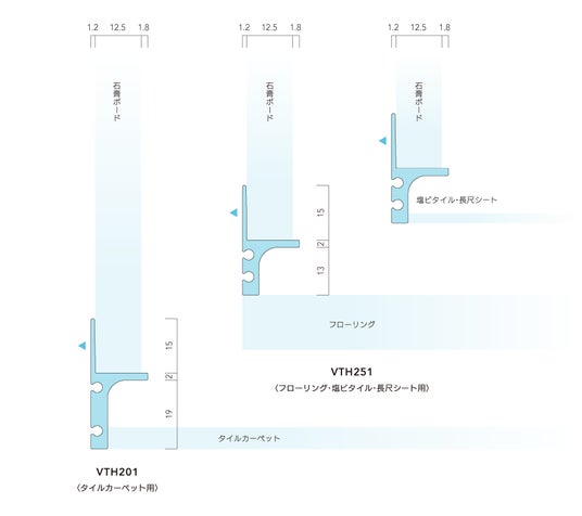 巾木の納まりは、床材ごとに、巾木勝ちにするか、床材勝ちにするかが異なる。この点をふまえ、フローリング・塩ビタイル・長尺シートに対応する一般的なタイプ(H251)に加え、従来の入巾木施工では実現が困難だったタイルカーペット用(H201)をラインナップ。これにより、Verta H2 はほぼすべての室内床材に対応し、幅広い建築シーンに入巾木納まりを実現する。