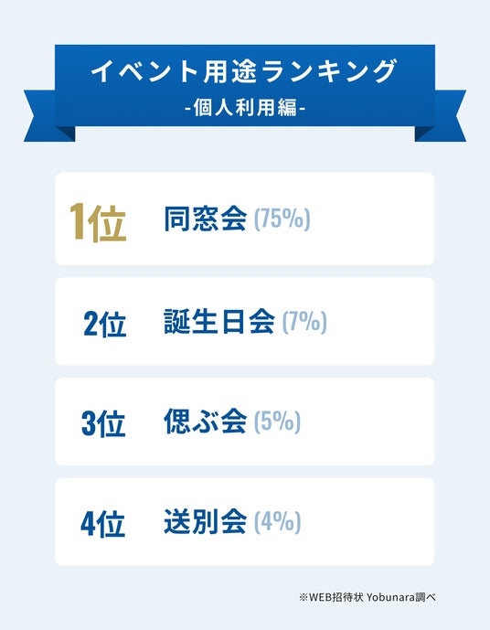 「WEB招待状」と言えば“結婚式”の招待状として使われるようになってきましたが、あらゆるイベントのWEB招待状が作れる『Yobunara(ヨブナラ)』の場合、個人ユーザーでは「同窓会」での利用が圧倒的に多い結果となりました。