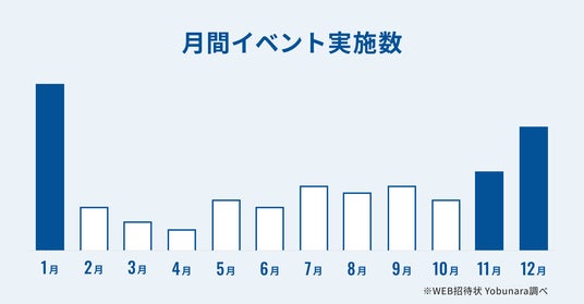個人イベントの実施時期を調査したところ、最も多かったのが「1月」の21%、次いで「12月」の15%、「11月」が10%という結果になりました。11月~12月末にかけてイベント実施数が増加し、年が明けた1月に年間のピークを迎える傾向にありました。