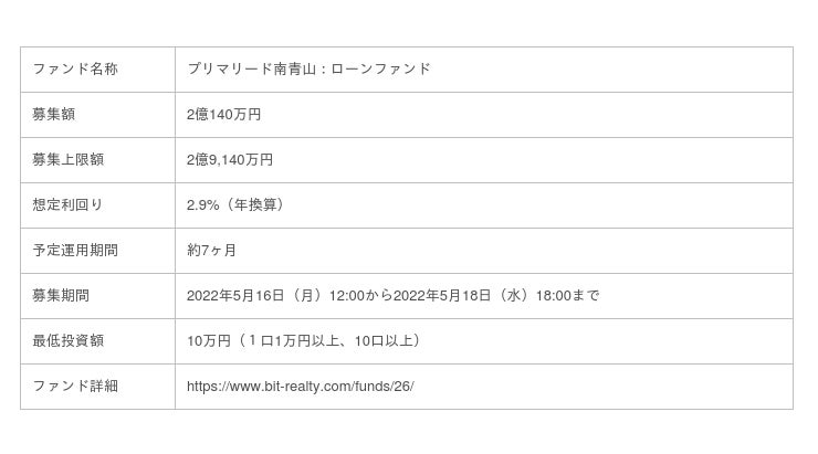 ビットリアルティ株式会社(本社:東京都千代田区、代表取締役社長:菊嶋勇晴、以下「当社」)は、個人でも非上場の不動産ファンドに投資ができるオンライン不動産投資プラットフォーム「bitREALTY(ビットリアルティ)」において、5月16日(月)12:00に「プリマリード南青山:ローンファンド」の募集を開始いたします。