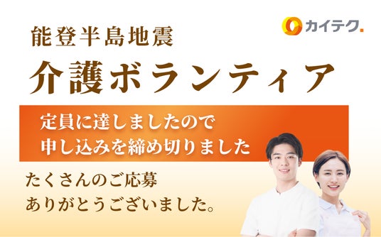 カイテク株式会社(本社:東京都渋谷区、代表取締役:武藤 高史、以下「カイテク」)は、公益社団法人 日本介護福祉士会と連携し、2024年2月2日(金)から令和6年能登半島地震の被災地支援のため、介護人材の県外ボランティアを募集しました。この募集は開始からわずか1日で定員に達し、最終的に6名のボランティア活動者が決定したことをお知らせします。