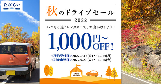 株式会社パム(本社:沖縄県那覇市、社長:長嶺 由成)は、旅行情報サイト「たびらい」のたびらいレンタカー(https://www.tabirai.net/car/)にて、秋のドライブセールを開始いたしました。対象予約受付期間中に対象商品を予約して、対象出発期間中に出発された方が対象となります。