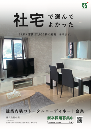 3Kとも称され、長年人手不足に悩む建設業界のイメージアップを図るべく、就活生に向けて採用ポスターの制作にあたった中園コミュニティ。現場見学、社員へのヒアリングを通してわかったことは、福利厚生の充実さ。中でも社宅は格安で充実した住環境が整備されており、就活生にもアピールできるのではと考えた。