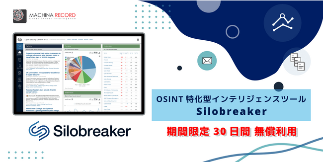「サイバーインテリジェンス」を活用したセキュリティソリューションを提供する株式会社マキナレコード(本社:東京都港区、代表取締役:軍司祐介、以下マキナレコード)とパートナー企業のSilobreaker社(英、以下Silobreaker)は、2023年6月19日(月)~2023年6月30日(金)の期間限定で、オープンソースインテリジェンス(OSINT)特化型インテリジェンス収集・分析ツールの無料トライアル第4弾を開始しました。