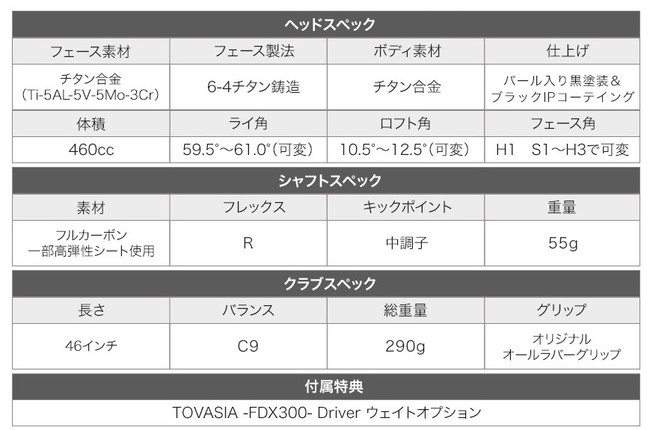 TOVASIA ドライバー FDX300 スペック表はこちら