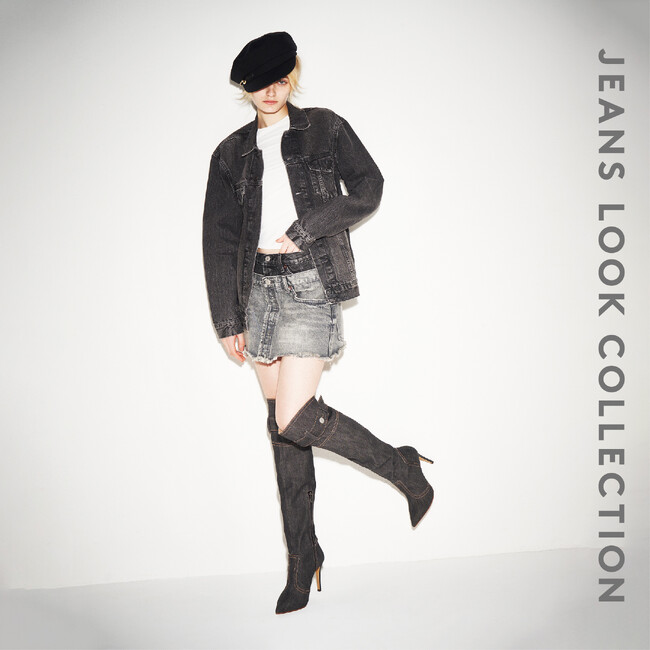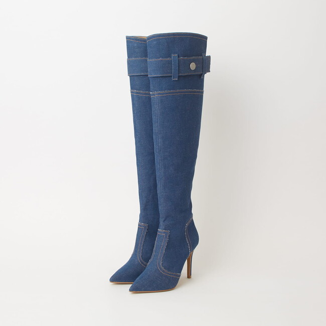 今シーズン注目のデニムをニーハイブーツに。ベルトや切替デザイン部分はあえて切りっぱなしの手法を取り、粗めのステッチワークで程よいカジュアル感とヴィンテージ感を表現。