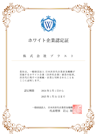 株式会社プラスト(本社所在地:埼玉県さいたま市、代表取締役:山下 友由)は、2024年2月1日に「ホワイト企業認定 ゴールド」に認定されたことをお知らせします。