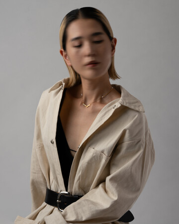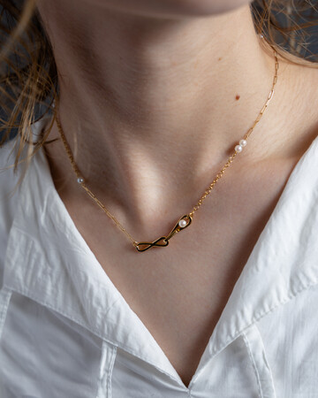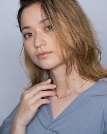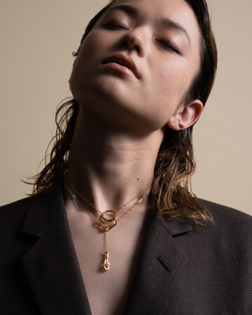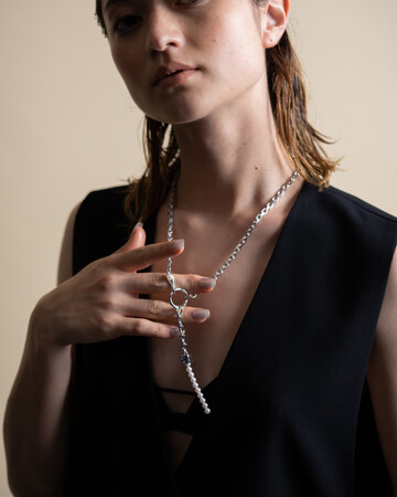 シンメトリーにあしらったパールと、ソリッド感があるチェーンとのコンビネーションが魅力のネックレスです。ありそうでなかったミニマルな表現は、着用した際に際立つ余裕のあるデザインを心がけました。