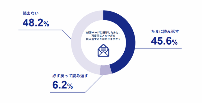 メルマガ内のリンクをクリックしてWebページに移動した後、再度同じメルマガを読み返すかどうかという調査を行いました。「読まない」が48.2%で最多となった一方、「必ず戻って読み返す」はわずか6.2%という結果になりました。
