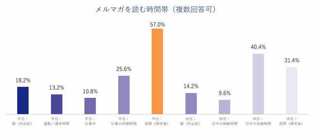 メルマガを読む時間帯で最も多かったのは「平日の夜間(帰宅後)」で57.0%、次点が「休日の日中(余暇時間)」で40.4%となっています。一方、朝(外出前)や通勤/通学時間は、よく読まれる時間帯と比較して1/3以下となりました。