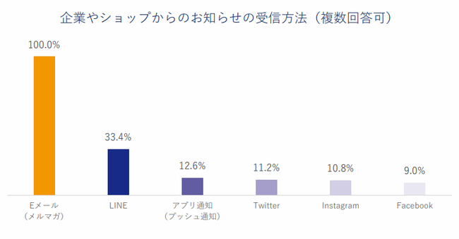 企業やショップからのお知らせを受け取る手段を問う調査では、LINEやTwitterなどのSNSよりも、Eメールで受け取っていると回答する人が多いという結果でした。