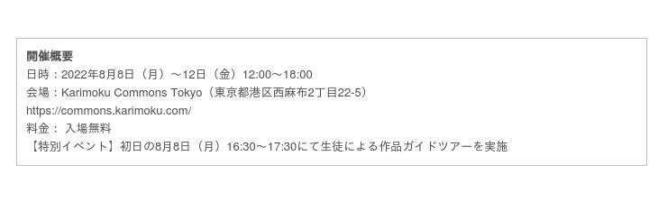 2022年8月8日(月)~12日(金)「Karimoku Commons Tokyo」にて開催、生徒による作品ガイドツアーも実施予定