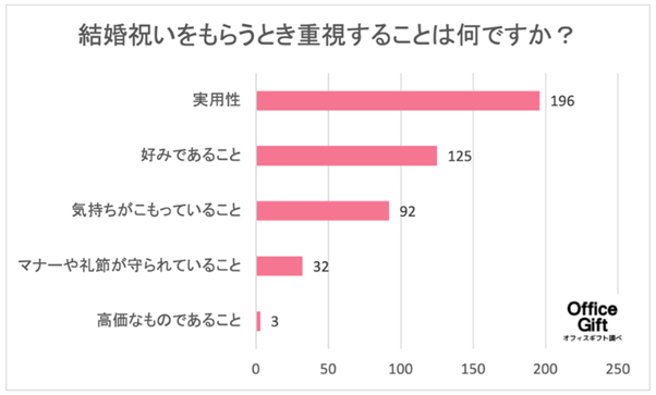 今回、「結婚祝いをもらうとき重視することは何ですか?」という質問では、多くの方が「実用性」と回答し「好みのものであること」が続く形となりました。