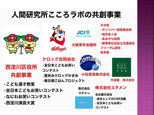 カウンセラーのお仕事から始まったこともあり、こどもお笑い道場やこども食堂など、こどもを支える多彩な活動を行っています。こども食堂のお弁当を調理しますと地域の飲食店が名乗り出てくれたり、食料支援をいただいている企業とイベントの共同開催をするなど、共創の取り組みが多く実現しています。