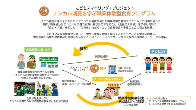 こども食堂等に通うお子様へのエシカル消費に関する食育プログラムを実施し、こどもたちを支援するネットワークとの信頼関係を構築。こどもたちの心と体の成長に必要な『食』や食に関わる『職』などの経験を届け、食品企業の様々な取組への理解と地域への社会貢献の仕組みの構築を目指します。