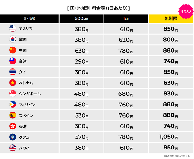 「ZEUS WiFi for GLOBAL」は1日あたりの基本料金が290円/日~と業界最安値級です。国・地域ごとに料金が異なり、1日あたりのデータ容量は「500MB」「1GB」「無制限」の3タイプから選べます。料金は(プラン料金+オプション料金)×ご利用日数となります。
