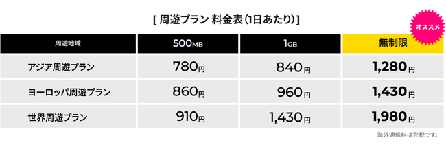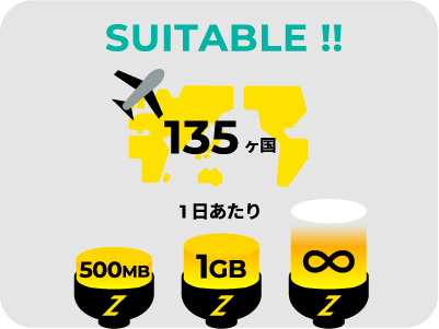 世界135の国と地域に対応し、周遊プランもご用意しています。さらに、1日あたりの容量が「500MB」「1GB」「無制限」の3タイプから選べます。 対応国・地域は公式サイト(https://zeuswifi-global.jp/)をご覧ください。