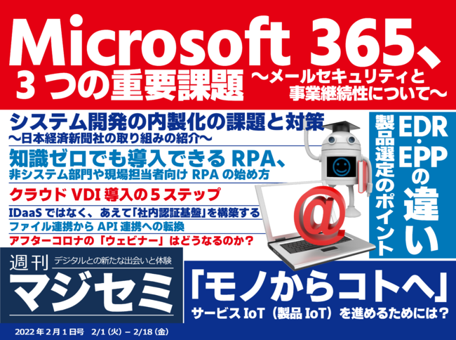 マジセミ株式会社(本社:東京都港区、代表取締役:寺田雄一、以下マジセミ)は、2022年2月1日(火)から18日(金)までのウェビナー番組表を更新しました。「Microsoft 365、3つの重要課題」「モノからコトへ、サービスIoT」など、42本のウェビナーがあります。