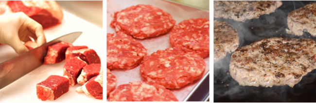 熟成肉をブロックのまま仕入れて粗めにミンチ。複数の部位をブレンドし、冷凍することなくチルドのまま焼き上げるから、ジューシーで肉粒感あふれる味わいをお楽しみいただけます。