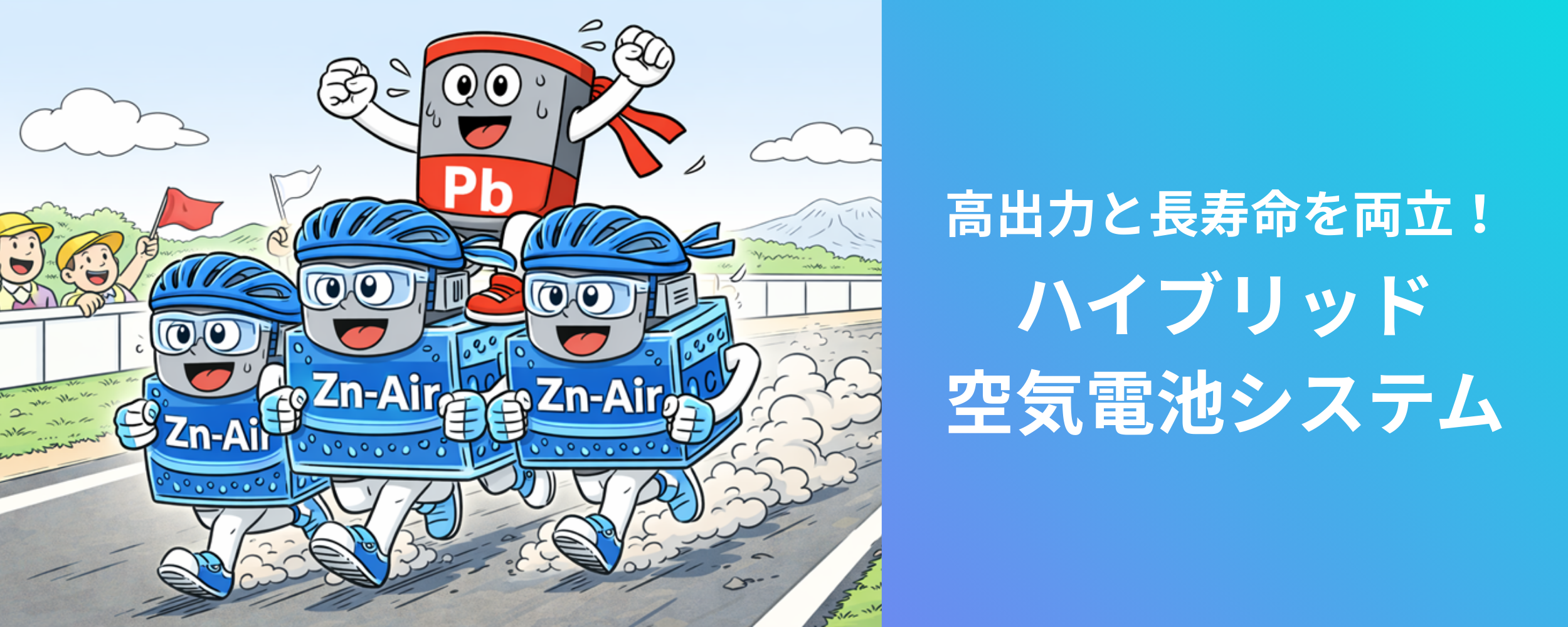 ハイブリッド空気電池システムの構築:高容量な金属空気電池と鉛蓄電池を組み合わせたハイブリッド空気電池システムを開発。金属空気電池を鉛蓄電池のエネルギー源としても利用することで、長時間の電力供給と安定した出力を両立させ、災害時でも多様な機器(通信機器、照明、小型家電等)を稼働させる仕組みを検証します。