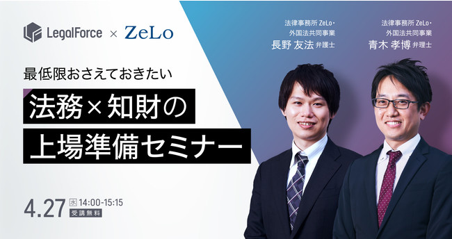 法律事務所ZeLoは、株式会社LegalForceとともに「目指せIPO!最低限おさえておきたい 法務×知財の上場準備セミナー」を開催します。2022年4月から、東京証券取引所の市場区分が再編され、上場で満たすべき要件が変更となりました。上場準備への影響について説明しながら、IPOまでの法務・知財面での基本的な流れから、両面でデューデリジェンスを行うメリットを解説します。「法務デューデリジェンスはよく耳にするけれど、知的財産デューデリジェンスはよく知らない…」という方におすすめです。