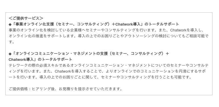 業務仕分けコンサルティング、テレワークの研修・コンサルティング、コスト最適化サービスも実施。