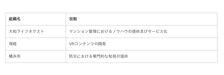 大和ライフネクストが持つ管理組合活動における課題解決の知見と、理経が持つVRコンテンツ生成技術を合わせることで「マンション防災の新しいカタチ」づくりに貢献するべく、本協定を締結することとしました。