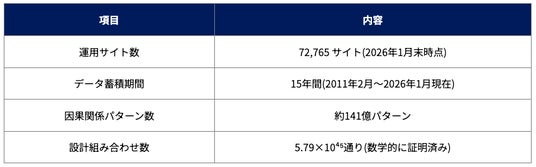 そして今、15年間・72,765サイト・約141億パターンの因果関係データを基盤とする、究極の因果推論エンジンAI「Athena」を解禁いたします。