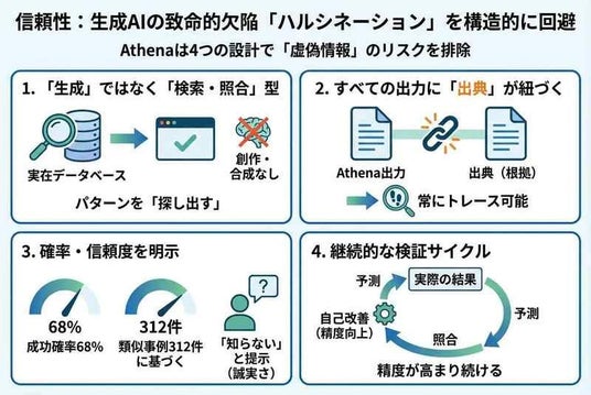 この141億パターンもの膨大な学習データに基づき、Athenaは「Aをすれば、Bという結果が得られる」という因果の法則を導き出します。